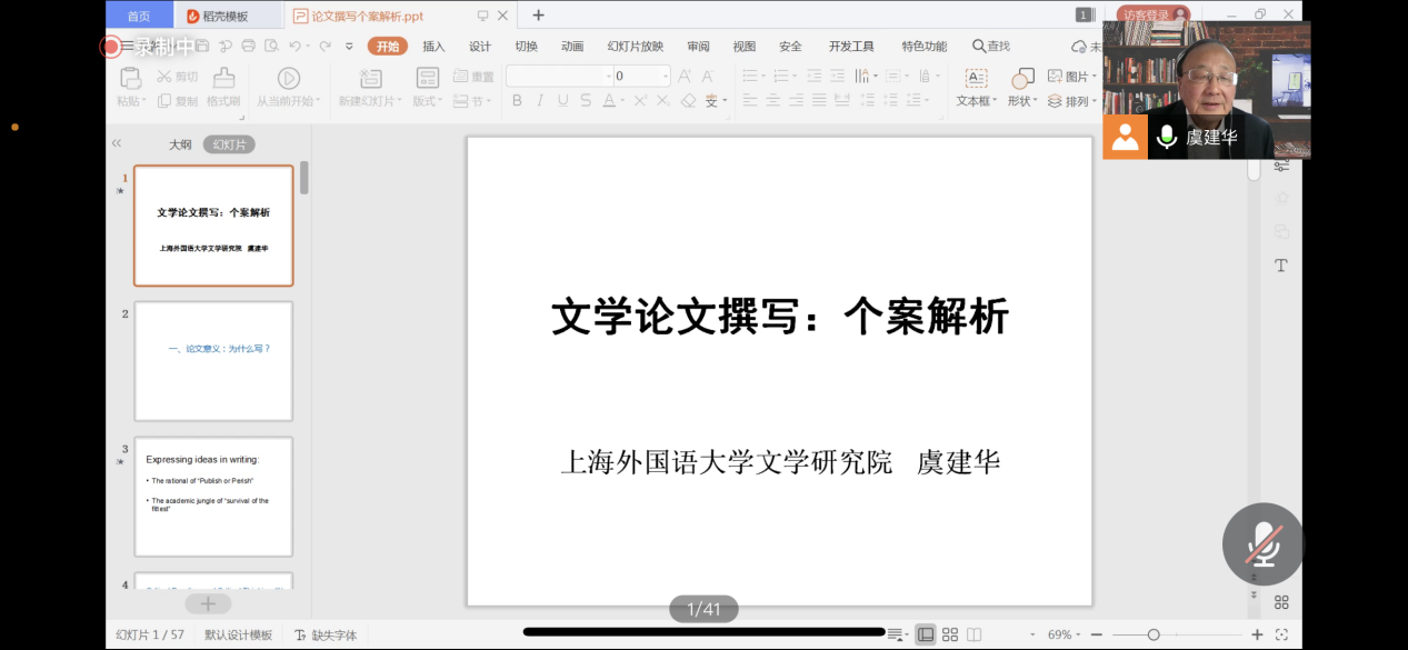 (通讯员:黄皓亮 金梓轩)2021年11月25日下午14:00,WilliamHill中文“南望今声”外语论坛系列讲座如期召开。上海外国语大学文学研究院的虞建华教授应邀为我院师生做题为“文学论文撰写:个案解析”的讲座。本次讲座采取了线上腾讯会议直播的形式,我院共140余名师生参与学习交流。
