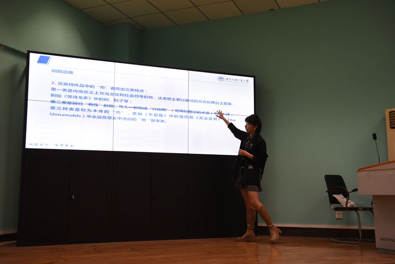 首先,李慷副教授进行开场致辞,简要介绍了主讲人郑杰教授,并对其到场表示了热烈的欢迎。讲座开始后,郑杰教授首先谈到了“贝克特的‘物性叙事’”这个研究主题的问题缘起和问题语境。郑杰教授认为贝克特的独幕剧表现出对声音和意识的强烈关注,声音作为全剧的唯一聚焦来表现意识,而声音的主体却语焉不详。在《克拉普的最后一盘录音带》(Krapp’s Last Tape,1958)中,“录音带”成为主角甚至唯一角色。由此,郑杰教授希望通过对《克拉普的最后一盘录音带》这一具体的剧本的分析,来探讨人与物之间的关系。在问题语境方面,郑杰教授阐述了自己对于“物性”的理解和定义,并分析了贝克特作品中的“物”所表现出来的三类特点。第一类是传统意义上充当文化和社会符号的物,这类物主要以象征的方式在舞台上呈现;第二类是回归“物性”的物,与人一起构成“行动网”;第三类是称为本体的“物”,永远在意义中流动的“物”叙事者。