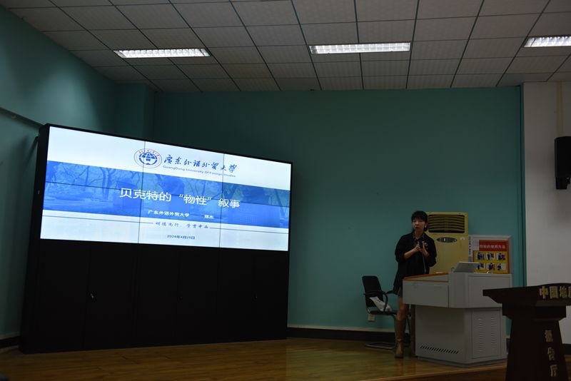 随后,为了帮助现场师生更好地理解讲座内容,郑杰教授带领大家共同阅读了剧本《克拉普的最后一盘录音带》并为大家播放了该剧的剧场版视频。通过阅读剧本、观看视频这样非常直观的方式,大家对该剧本内容及其作者贝克特有了更为充分的了解,这为讲座后半部分内容的顺利开展奠定了基础。随后,郑杰教授阐述了自己的基本观点。郑杰教授认为,贝克特的机器是一种“生产性”而非“缺失性”的想象,是一种使消费者成为生产者的生产方式。录音机和录音在舞台上制造了新的时间和空间,在新的时间和空间中,物制造了依赖于物和主体意识的心理现实。在这种意义上,录音构建了意识的新的物质形态。从当时的录音技术入手,郑杰教授细述了录音机和录音带背后的机器逻辑。以此为切入点,郑杰教授阐释了录音机作为“生产者”的物,其与人之间的关系。郑杰教授认为,在录制磁带和播放磁带的过程中,克拉普既是主体又是客体。而在这个过程中,录音带作为人类活动进程的参与者,它参与构建甚至桎梏了人的意识和自我。随后,郑杰教授还谈到了贝克特对于物和意识的认识与康德物自体概念的影响关系。郑杰教授认为贝克特深受普鲁斯特、叔本华和康德的影响,在处理记忆和意识的方法上,并没有脱离笛卡尔式的传统主体哲学。最后,郑杰教授从叙事结构、叙事聚焦、叙事情节和行动三方面对“物叙事”进行了总结阐述。