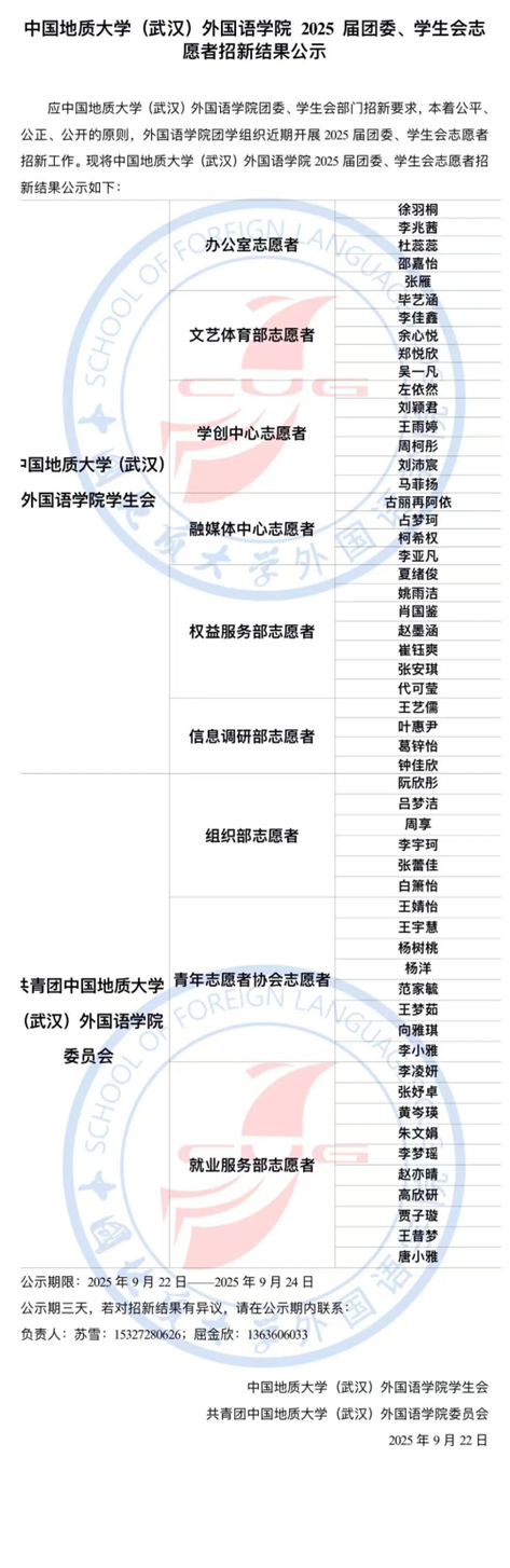 应WilliamHill中文团委、学生会部门招新要求,本着公平、公正、公开的原则,WilliamHill中文团学组织近期开展2025届团委、学生会志愿者招新工作,现将WilliamHill中文 2025 届团委、学生会志愿者招新结果公示如下: