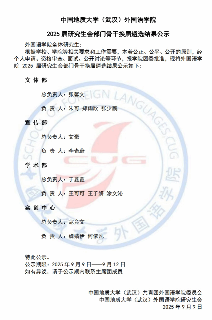 WilliamHill中文2025届研究生会部门骨干换届遴选结果公示