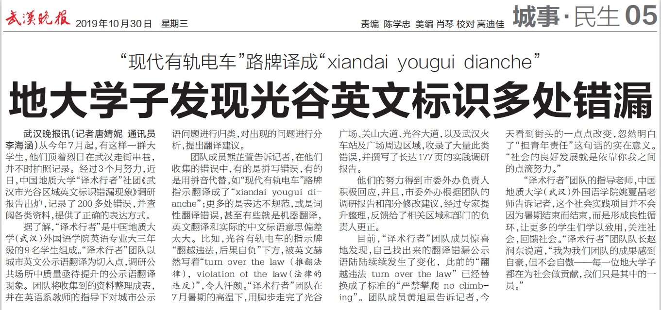 (通讯员 赵润东)2019年10月30日,长江日报和武汉晚报接连报导我院暑期社会实践团队“译术行者”2019年暑期针对武汉城市英文标识的调研,11月1日,武汉电视套四套“经视新看点”栏目对团队成员、指导老师以及学院领导进行了专题采访。