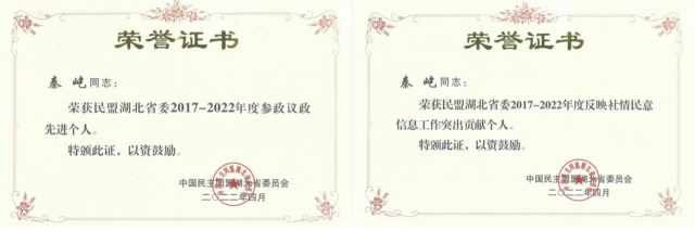 (通讯员:戴薇)近日,我院教师、民盟地大委员会秦屹在民盟湖北省委会召开的“矢志不渝跟党走、携手奋进新时代”政治交接主题教育动员大会上获得“2017-2022年度参政议政先进个人”“2017-2022年度反映社情民意信息工作突出贡献个人”荣誉称号。