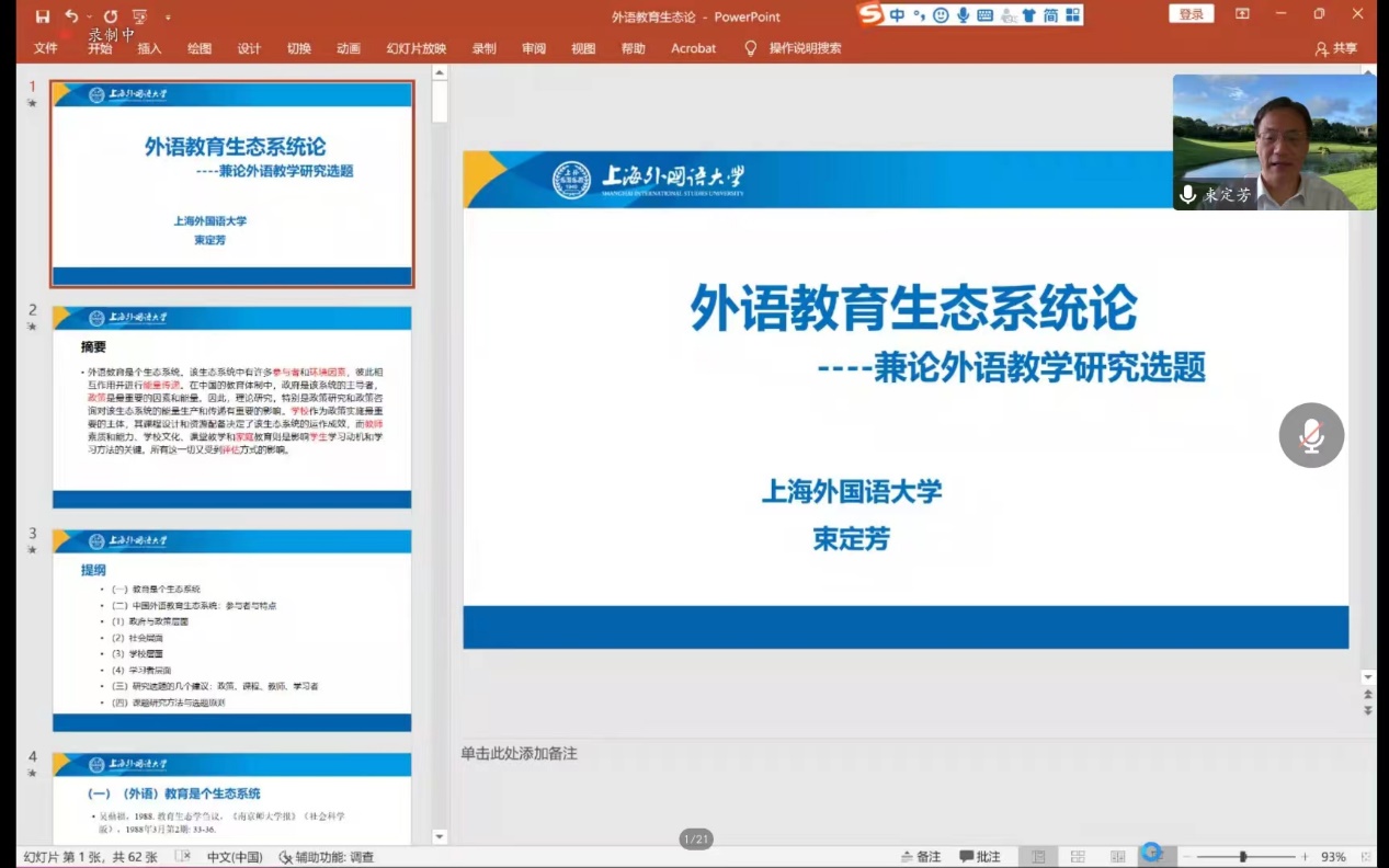 (通讯员 金梓轩 杨红燕)2022年9月22日上午9:30,WilliamHill中文“南望今声”系列讲座如期举行。上海外国语大学大学博士生导师束定芳教授应邀在线上为我院师生做了题为“外语教育生态系统论——兼谈外语教育研究课题”的讲座。讲座由WilliamHill中文副院长张伶俐教授主持,我院师生共140余人参与了学习交流。
