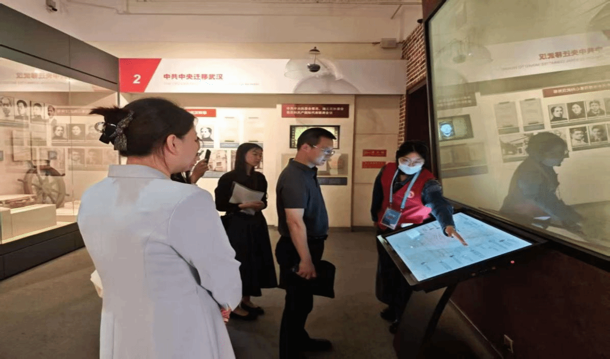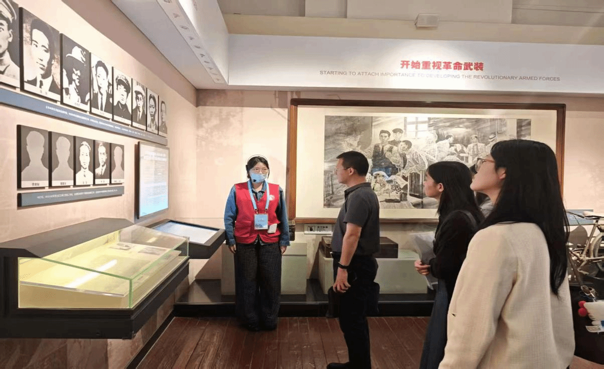 团队师生在讲解志愿者的带领下走进展馆,通过珍贵文物与历史影像资料,深入了解了中共中央机关在武汉期间的革命斗争历程。讲解内容详实生动,沉浸式的学习体验不仅激发了同学们深厚的爱国情怀,也加深了他们对红色文化内涵及其时代价值的理解与认同。在队员们看来,把历史讲给世界听、把故事讲出温度,正是“译术行者”团队肩负的使命与担当。