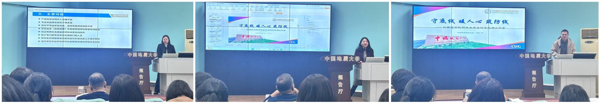 何霜、刘雪莲、李菲三位导师依次做了分享。何霜老师分享了指导硕士毕业论文的心得体会;刘雪莲老结合寒假期间参加的导师培训围绕翻译硕士论文写作和展开交流;李菲老师汇报了她对在读翻译硕士研究生及已毕业学生调查问卷结果,为后续优化培养方案提供了数据支撑。